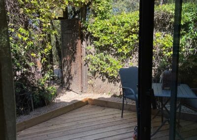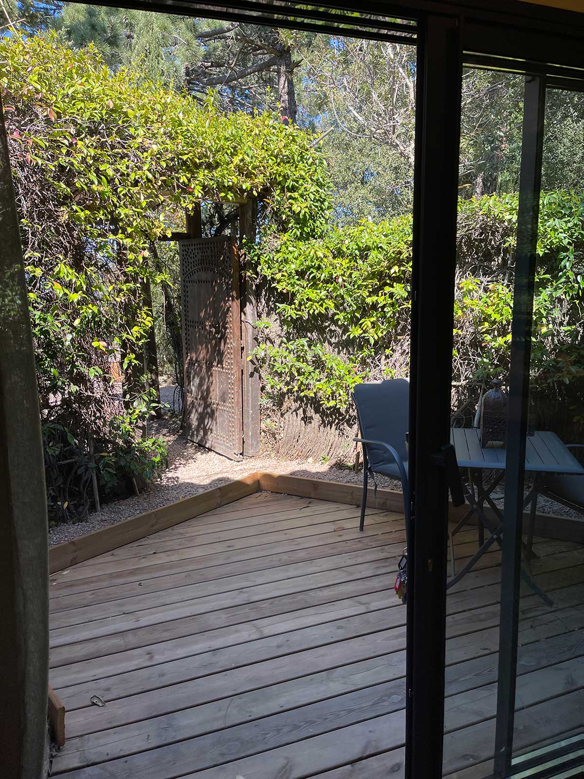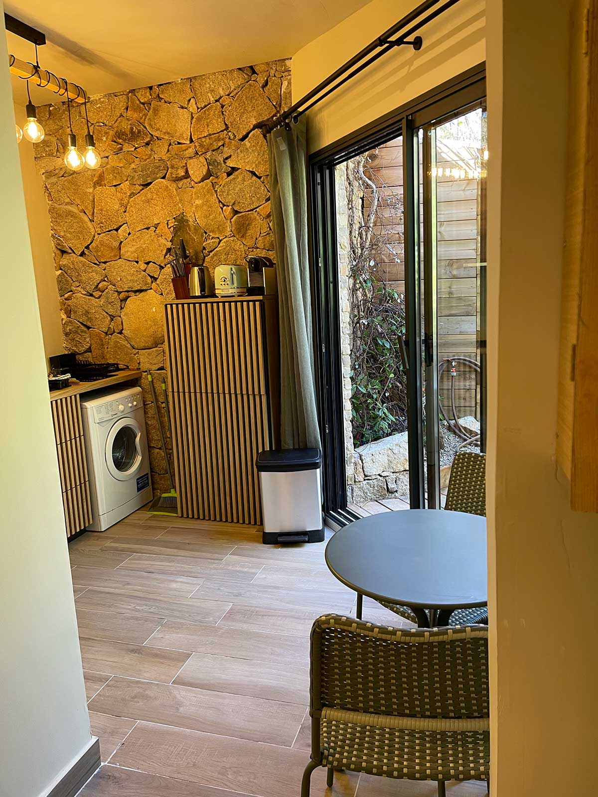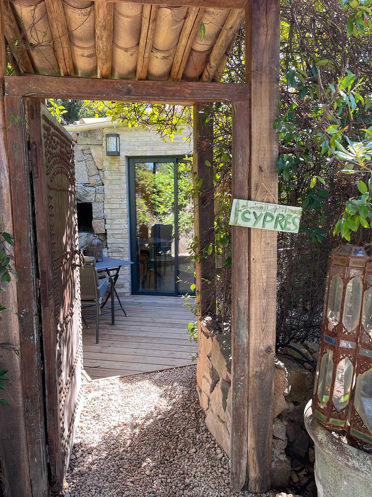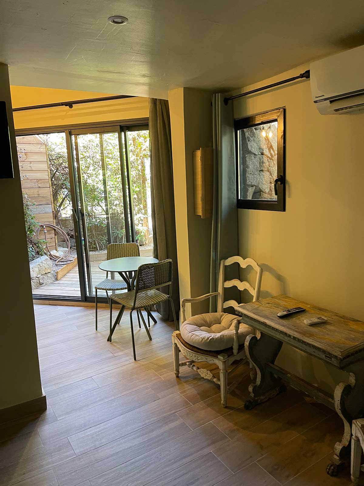 Vous bénéficiez d’un petit jardin clos de 25 m2 avec barbecue en pierres. Vous sortez par une porte ancienne et accédez aux piscines et à la plage.
