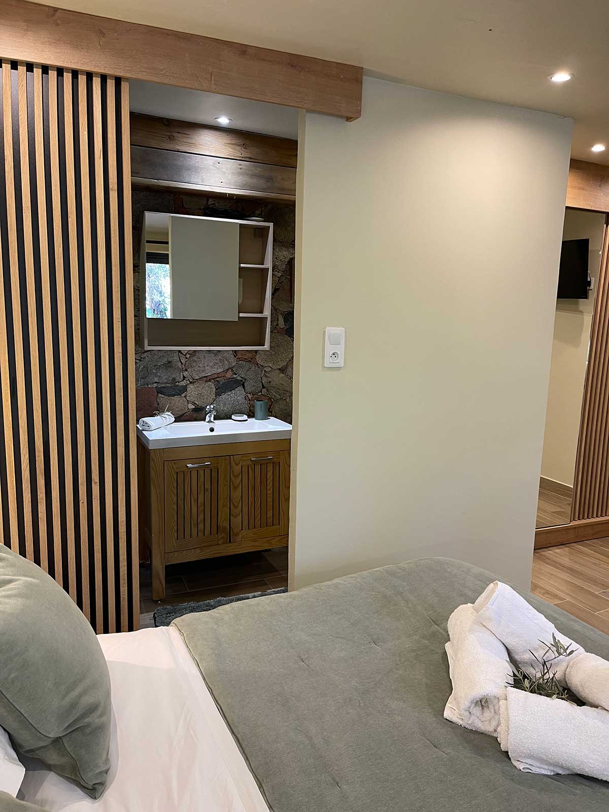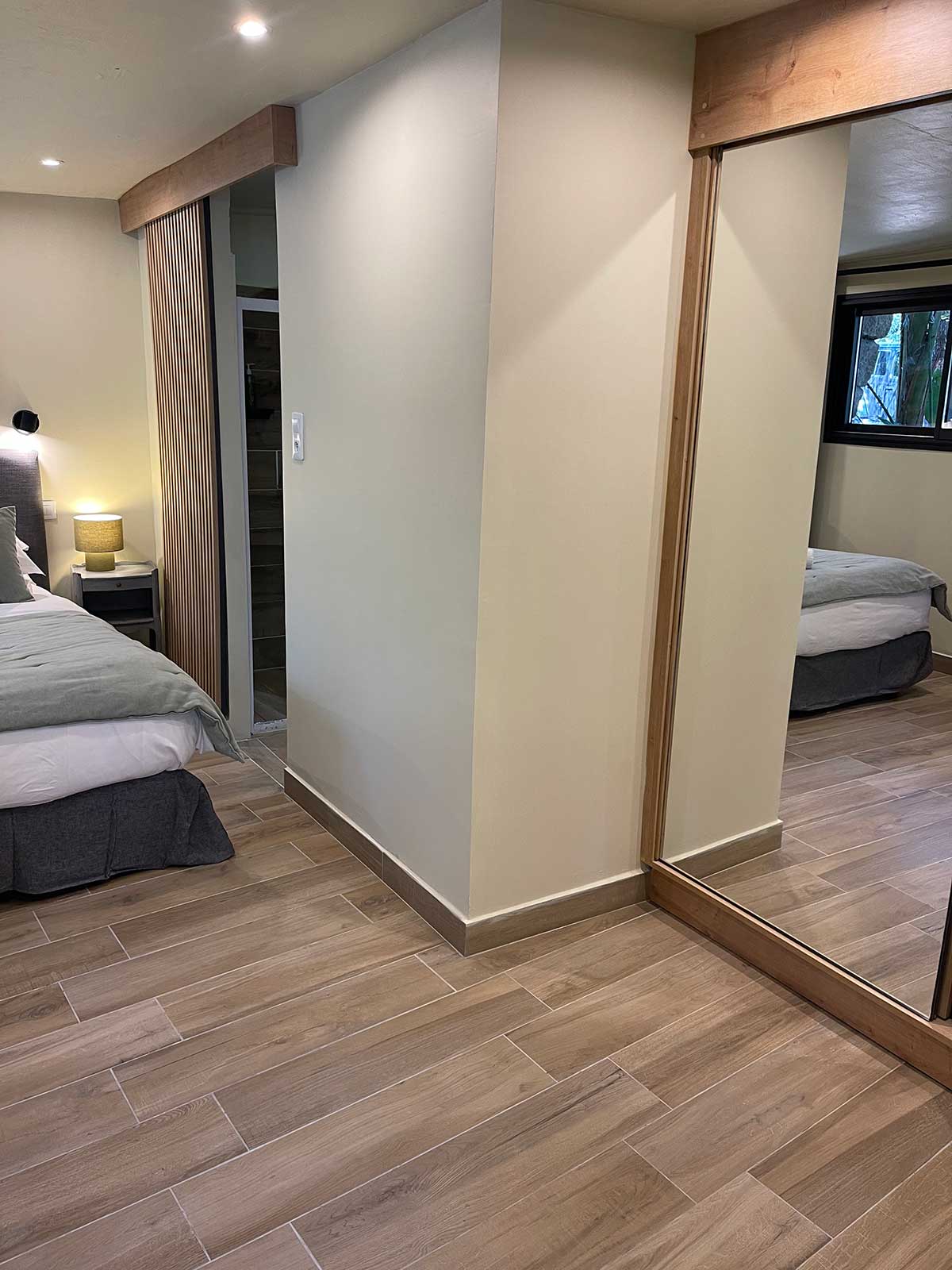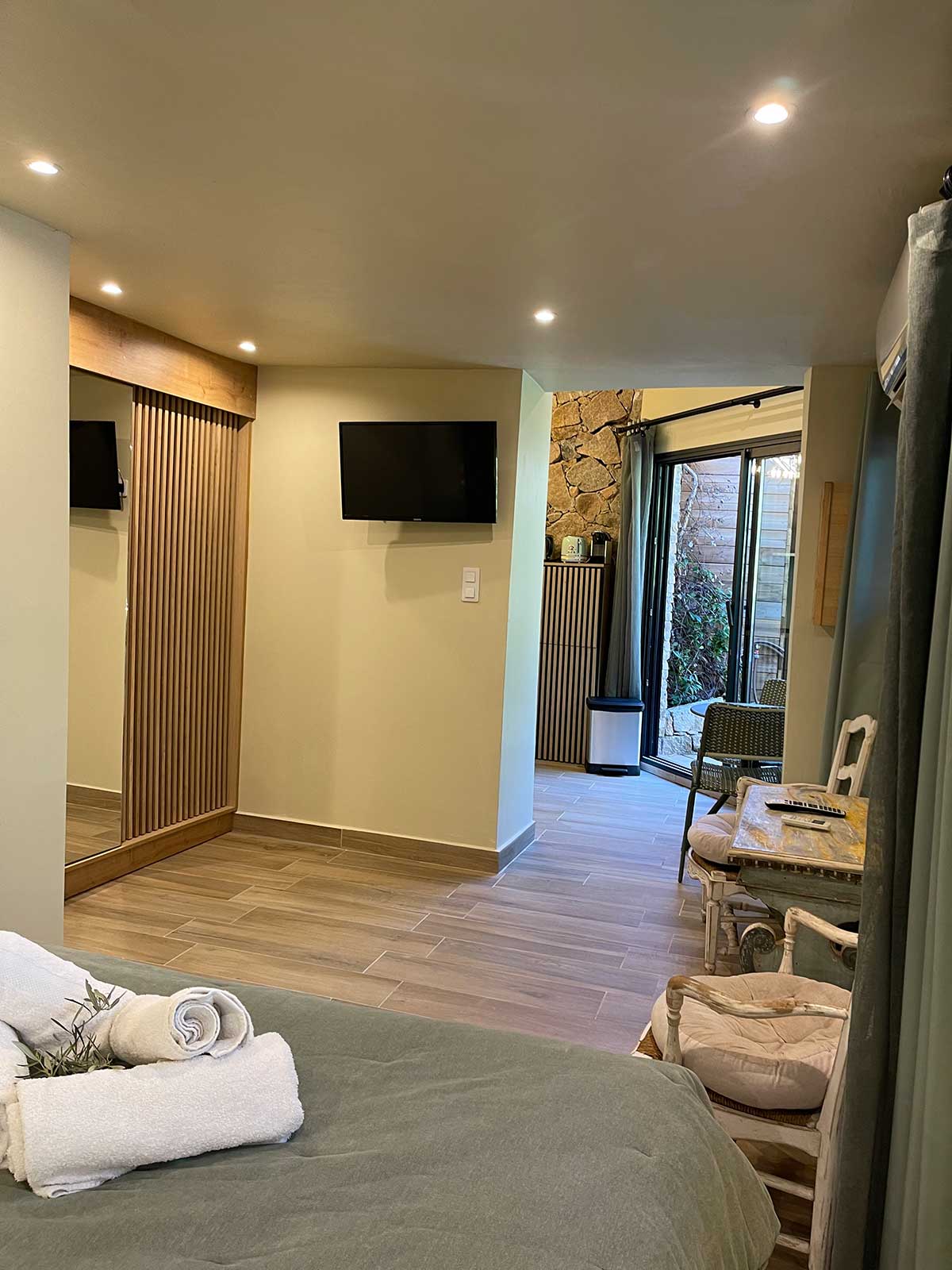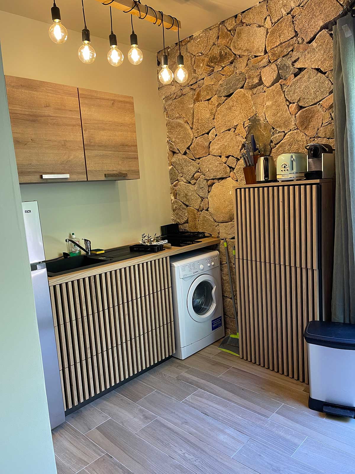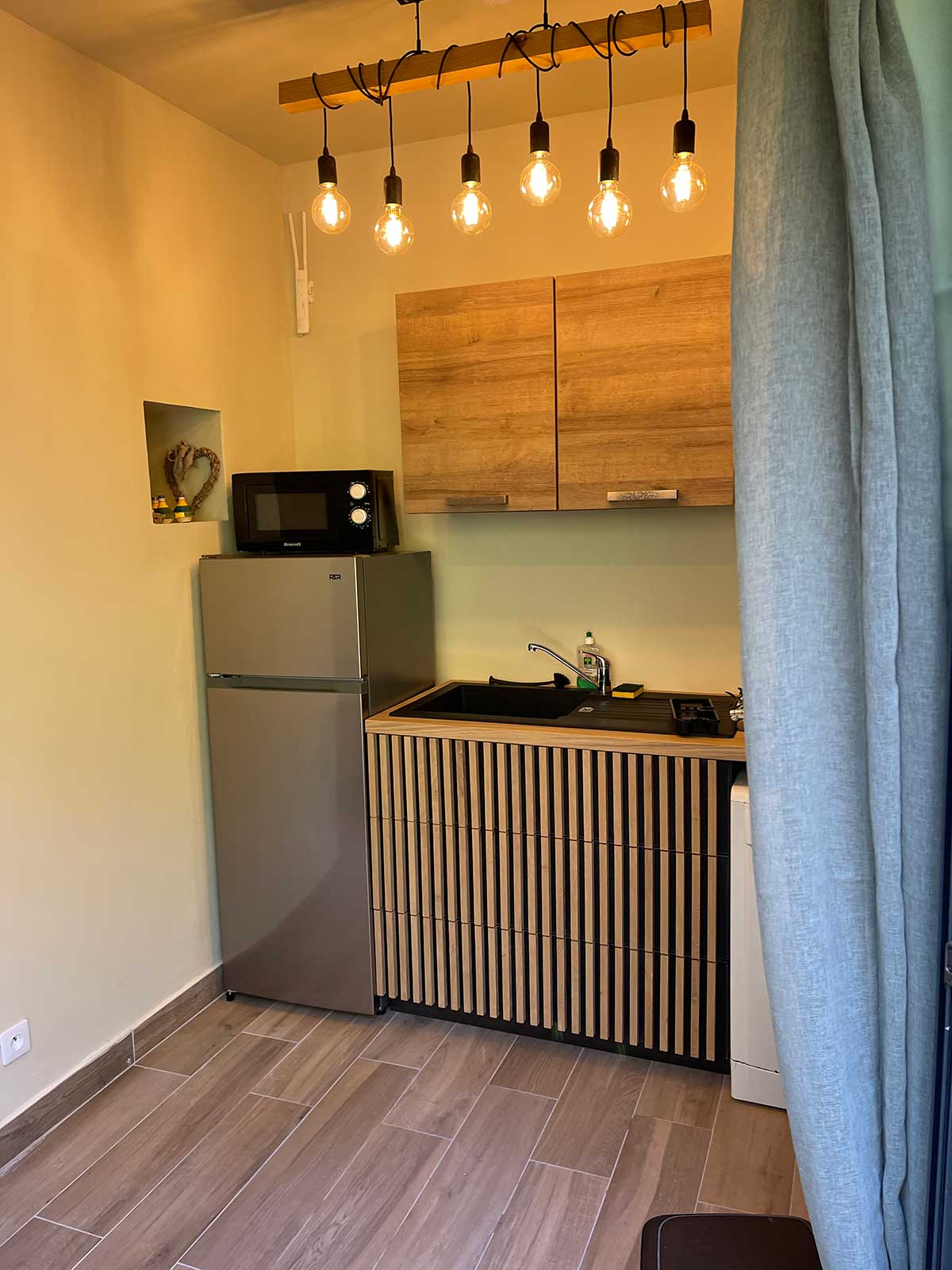 Il est composé d’une chambre de 20 mètres carrés avec un lit de 160, une kitchenette équipée (Nespresso, grille pain, cafetière classique, théière, lave linge, micro ondes, plaque 2 feux, toute la vaisselle pour 2, TV écran plat, salle de bains avec douche, lavabo et WC.